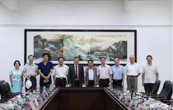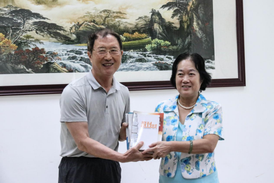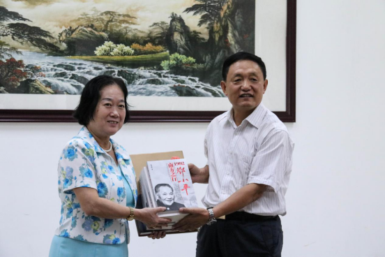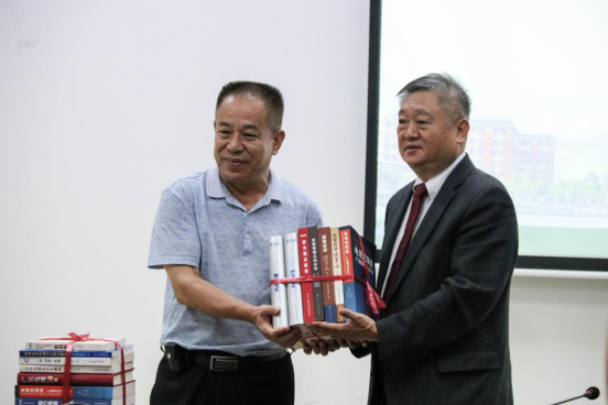 王庭槐校长(右一)接受杨运芳执行秘书长(左一)赠书