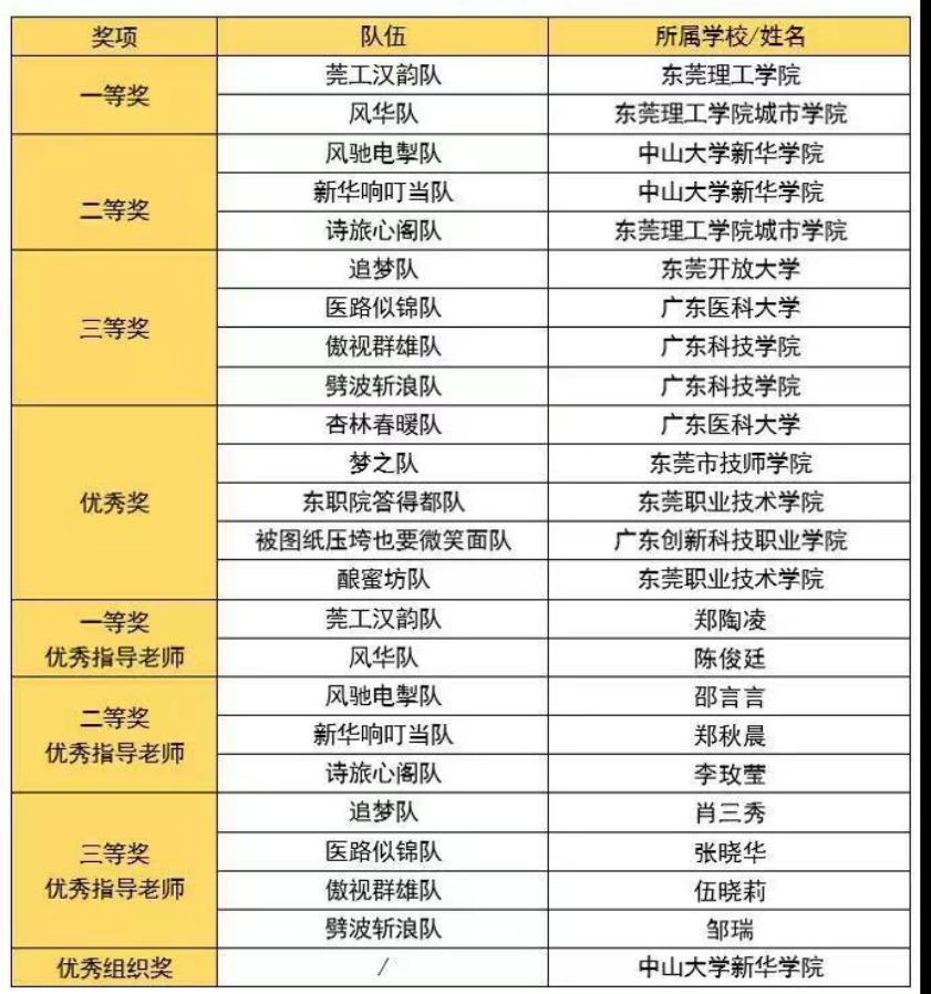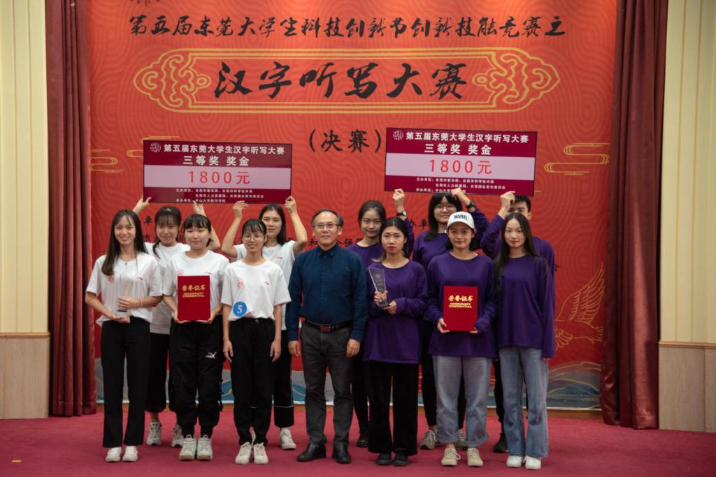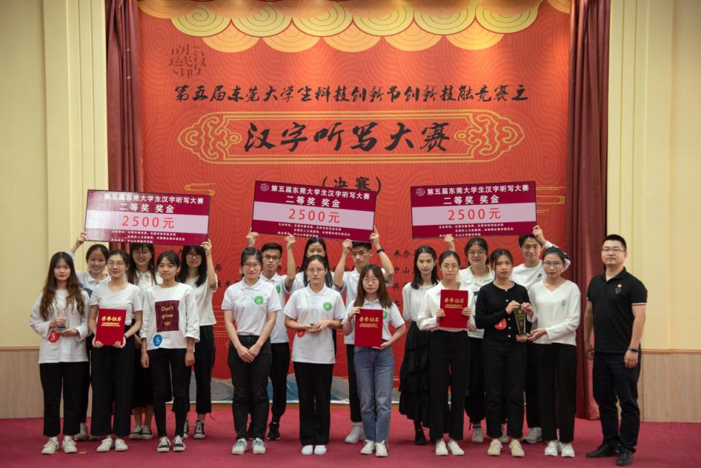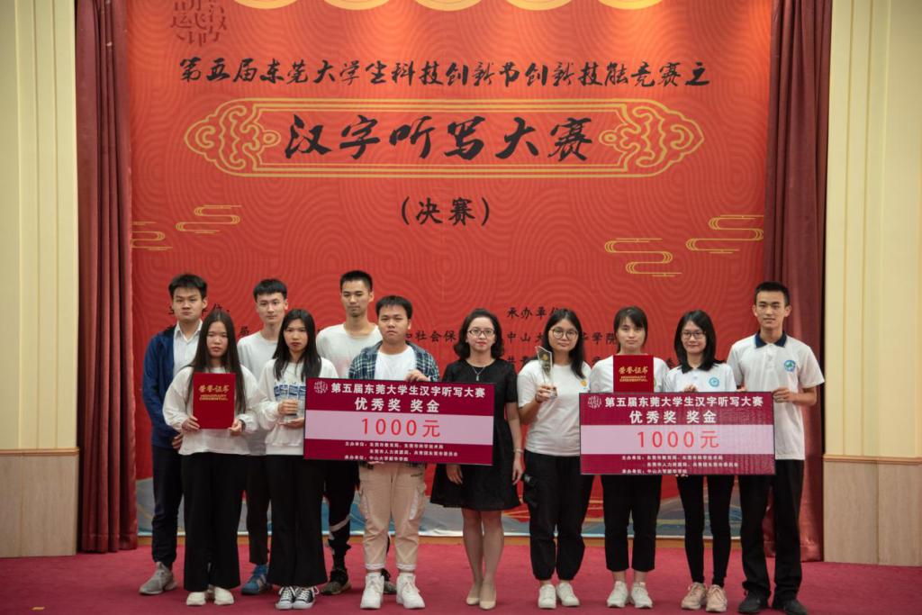 通过紧张激烈地角逐,来自东莞理工学院的“莞工汉韵队”与来自东莞理工学院城市学院的“风华队”凭借扎实的汉字基本功和灵活应变的现场反应能力脱颖而出,获得比赛的一等奖;来自中山大学新华学院的“风驰电掣队”和“新华响叮当队”,来自东莞理工学院城市学院的“诗旅心阁队”获二等奖;来自东莞开放大学的“追梦队”,来自广东医科大学的“医路似锦队”,来自广东科技学院的“傲视群雄队”和“劈波斩浪队”获三等奖。