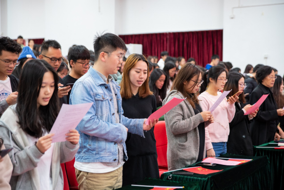 “我宣誓:忠于中华人民共和国宪法,维护宪法权威,履行法定职责……为建设富强、民主、文明、和谐、美丽的社会主义现代化强国努力奋斗!”在李岚教授的领誓下,全体师生举起右手握拳,一起面向宪法和国旗庄严宣誓。