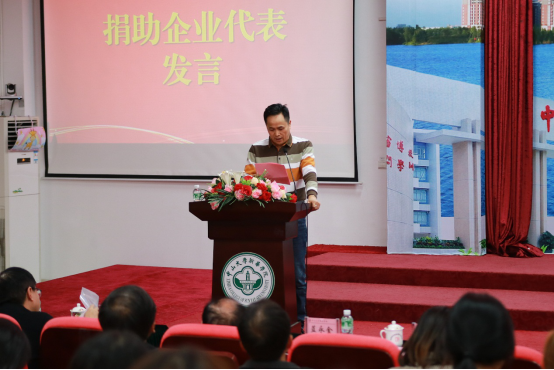 捐赠企业广东华坤建设集团有限公司代表周盛光副总裁在大会上发言。他向获奖同学表示祝贺,并把华坤集团“以奋斗者为本,诚信、学习,追求卓越”的理念分享给同学们,希望获奖同学敢于做梦,勇于试错,不怕困难,不断学习,追求卓越,奋斗不止。
