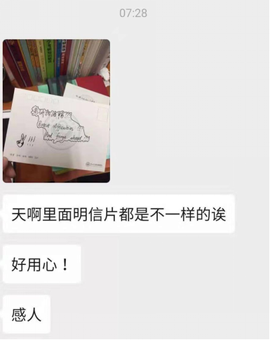 在暖心礼包中,每个考研的同学还收到一份专属的“温馨祝福卡片”,每一张印有学校风景的明信片都是敬爱的老师、亲爱的学弟学妹们亲手执笔所写。卡片上,学弟学妹加油和祝福的话语、老师的悉心指导,表达出老师对学生满满的爱意,也是给考研的同学最后“征途”中莫大的鼓励。