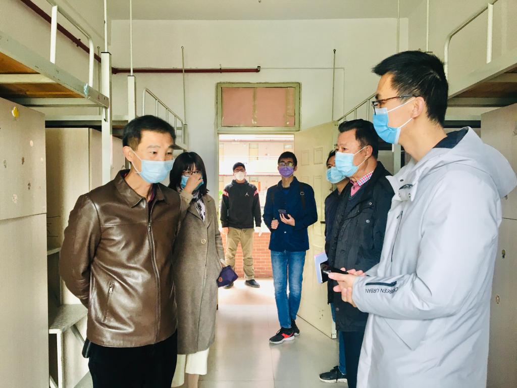 黄伟雄副镇长(右三)、曹梅主任(右一)代表麻涌镇人民政府调研团到我校东莞校区检查指导防疫工作