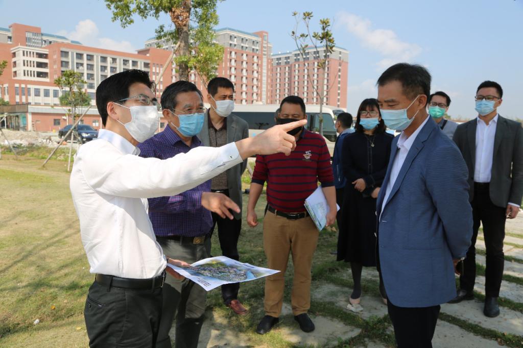 东莞市麻涌镇委书记黄桥法(左一)一行实地调研中大新华东莞校区工程复工建设情况
