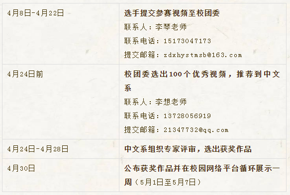 4.所有参赛均以视频形式体现,格式为:mp4,wmv,avi, flv。视频文件命名格式为:应以联系方式+姓名+学号+专业+院系+朗诵名称。