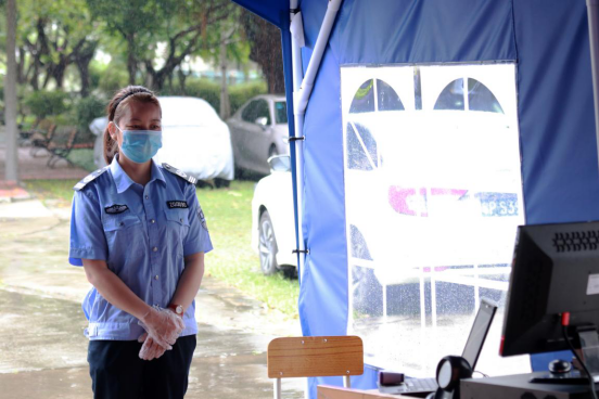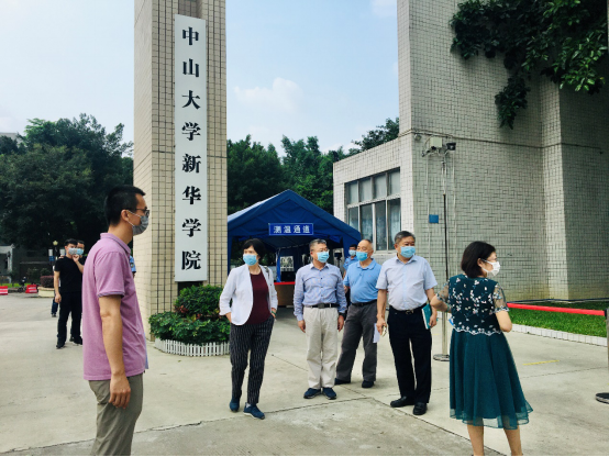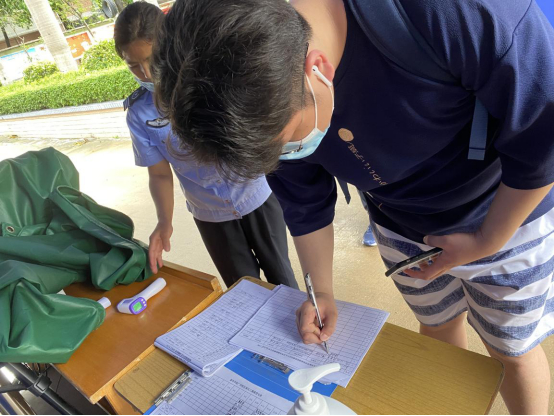 学生通过校门的测温通道,扫ixh小程序健康码,查看“粤康码”或“穗康码”,测体温、检查“核酸检测证明”,发放《中山大学新华学院2020年春季学期学生返校须知》及口罩等防疫爱心包