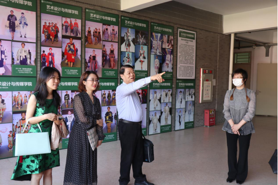 李中生副校长(左三)、刘霖霖校长助理(左一)向广东省教育厅高等教育处处长姜琳(左二)介绍艺术设计与传媒学院服装与服饰设计作品展