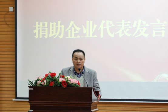 捐赠企业广东华坤建设集团有限公司代表周盛光副总裁在大会上发言,他向获奖学生表示了祝贺,并希望同学们怀着感恩的心,珍惜时光,努力学习,在艰苦奋斗中锤炼意志品质,在创新创业中增长智慧才干,将来做对国家、对人民、对社会有用的人。