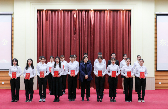 企业代表尚荣女士(第一排左六)为东莞玖龙纸业助学金获奖学生颁奖