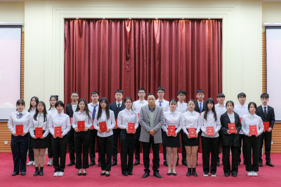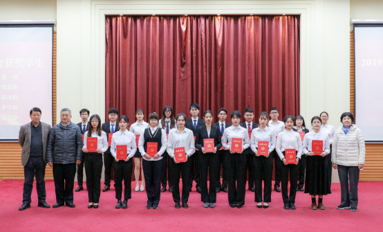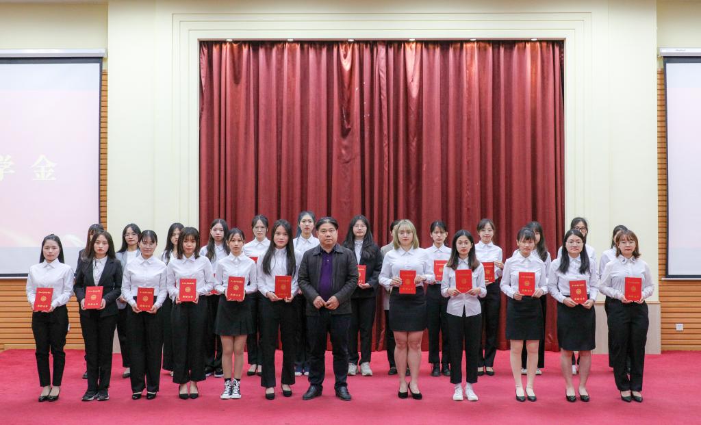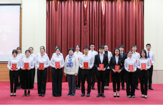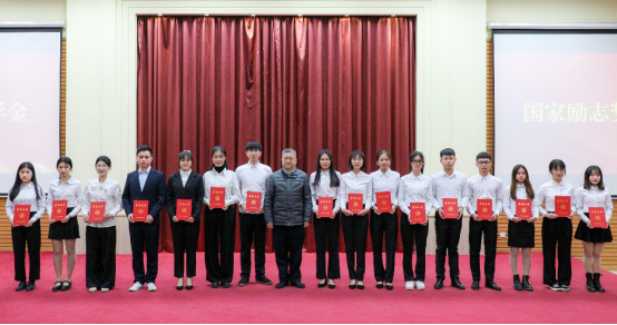 周云书记(第一排左五)为学校奖学金获奖学生颁奖