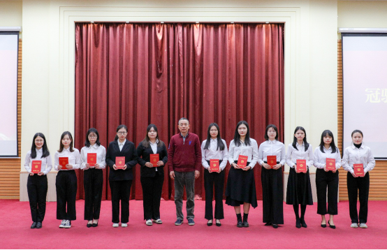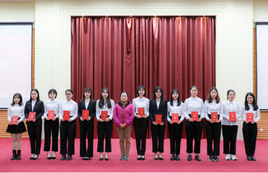 郑穗芬校长助理(左七)为“勤工助学之星”获奖学生颁奖