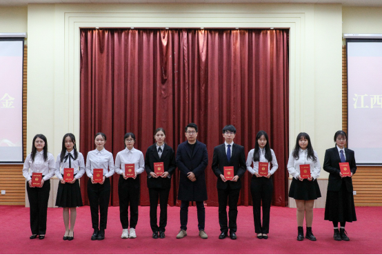 企业代表许嘉隽先生(左六)为江西广东商会奖学金获奖学生颁奖