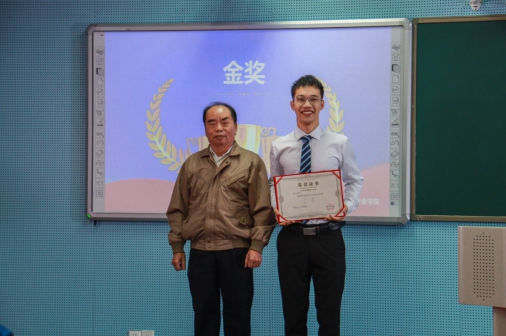 蓝永金副校长、副书记(左一)为获得金奖的参赛队伍颁发荣誉证书