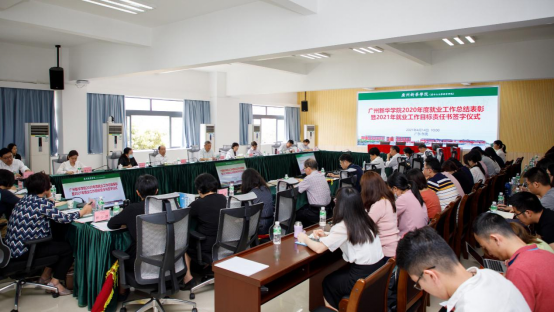 为表彰先进,树立典型,4月14日,广州新华学院(下文简称“我校”)于东莞校区召开2020年度就业工作总结表彰暨2021年就业目标责任书签字仪式会议。受新冠疫情的影响,我校2020届的毕业生就业工作面临诸多挑战。在全校师生的共同努力下,我校毕业生就业局势在保持总体稳定,取得不俗成绩。我校校长王庭槐,党委书记周云,副校长、副书记蓝永金,副校长李中生,校长助理郑穗芬,学生处副处长、学生就业指导中心主任刘艳,各院系领导、老师、毕业班辅导员及毕业生导师等教师代表参与会议。会议由学生处处长徐仲亨主持。