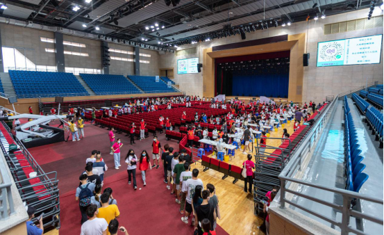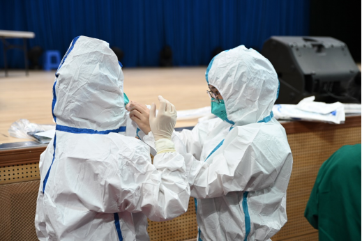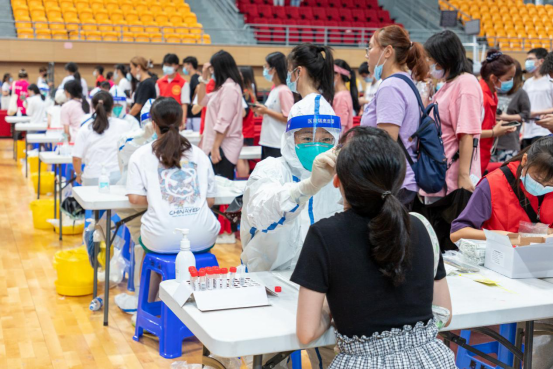 东莞校区全员核酸检测在体育馆开展,医护人员全副武装,操作规范,争分夺秒地完成检测任务;学校各职能部门迅速做好场地布置、物资运输、志愿者上岗等准备,严格按照规定在校体育馆内集结就绪。