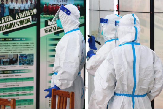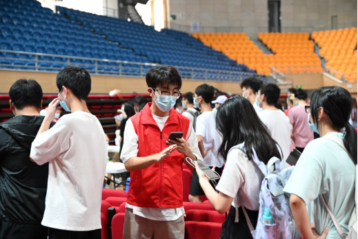 志愿者在核酸检测等待区引导师生登记核酸检测个人信息