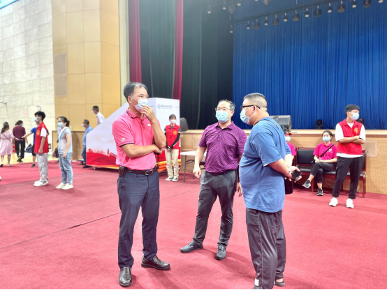 蓝永金副校长、副书记(左三),广东东宝集团副董事长刘荣宏(右一)现场指导东莞校区核酸检测现场布置