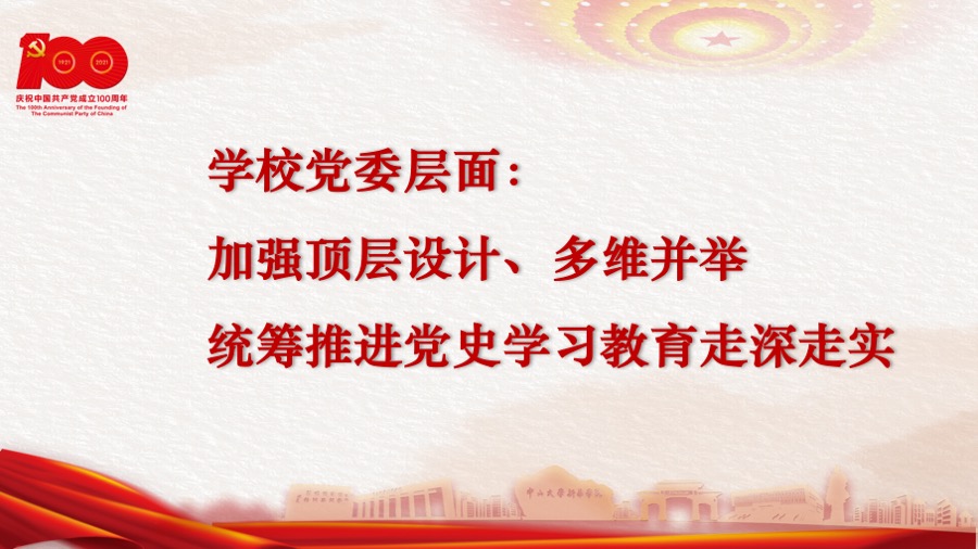 会议最后,周云同志作学校党史学习教育阶段性工作集锦专题汇报。报告以图片、视频等形式生动展示了3月12日学校党委召开党史学习教育动员大会以来,各项重点工作取得的阶段性成效。她强调,学校党委将继续加强顶层设计、多维并举,统筹推进党史学习教育走深走实;同时,各基层组织要持续加强组织策划、明晰责任,扎实推进党史学习教育生根见效。