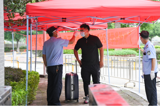 门岗保卫严格落实按照入校测温流程:“佩戴口罩、扫码、亮码、测温”