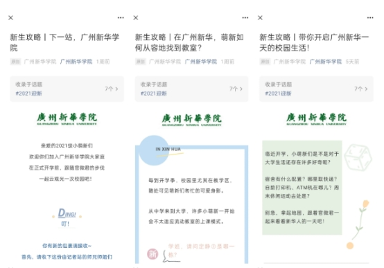 此外,学校各校级网络媒体平台纷纷利用网络信息技术手段,线上线下联动打造热烈迎新氛围。“广州新华2021级新生报到流程、接送服务指南”“智能水表使用指南”以及包含衣食住行的“新生攻略”系列推文,帮助新生“人未到,心已至”,提前了解校园生活。