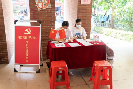 为充分发挥共产党员的先锋模范作用,贯彻践行“我为群众办实事”的号召,引导新生积极向党组织靠拢,经济与贸易学院和管理学院等院系党总支在报到点特别设立“党员服务岗”,为新生提供入党咨询及答疑服务,并协助报到处的师生完成新生入学报到等事宜,前往新生宿舍协助其解决内务等问题。