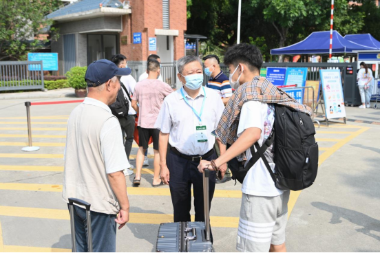 王庭槐校长(右一)在报到点与新生热情打招呼