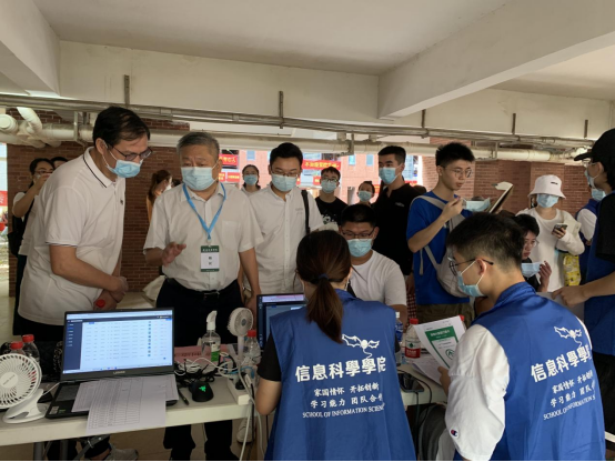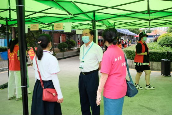 王庭槐校长(上图右一,下图左二)在校门口临时观察点与报到点指导工作