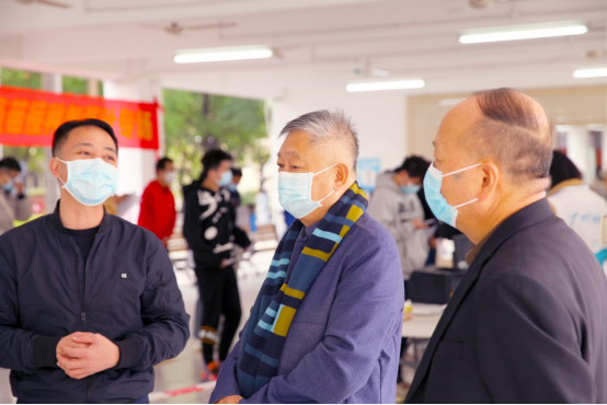 我校党委副书记、校长王庭槐(中),凤凰街道党工委书记李汶强(左)在现场组织指导疫苗接种工作