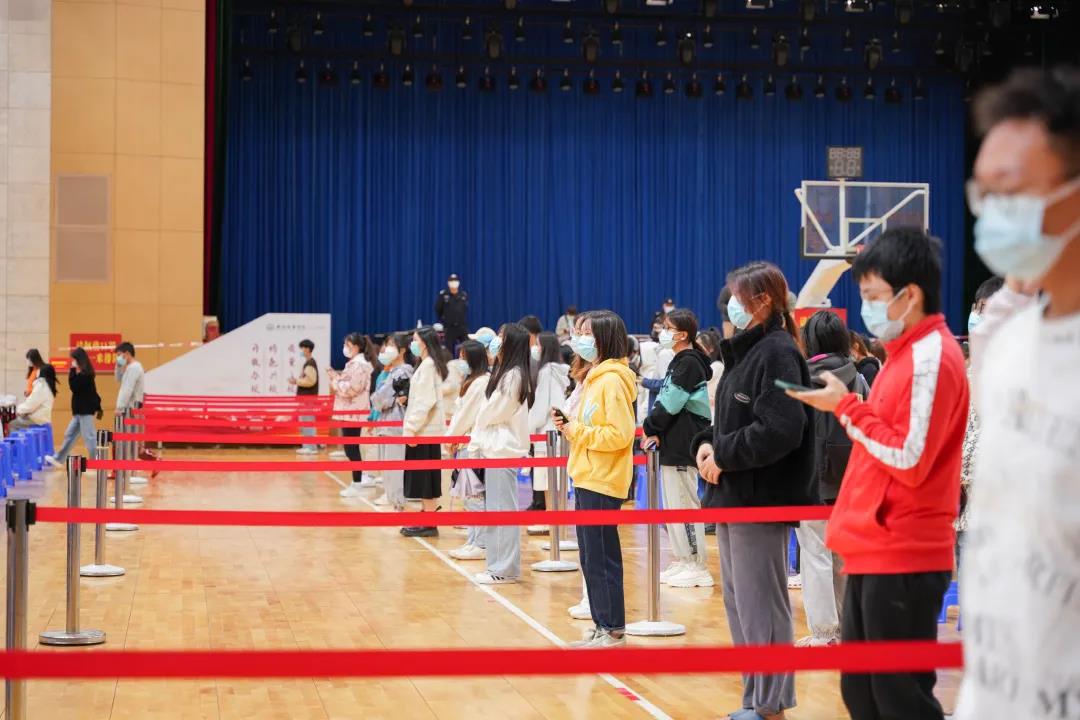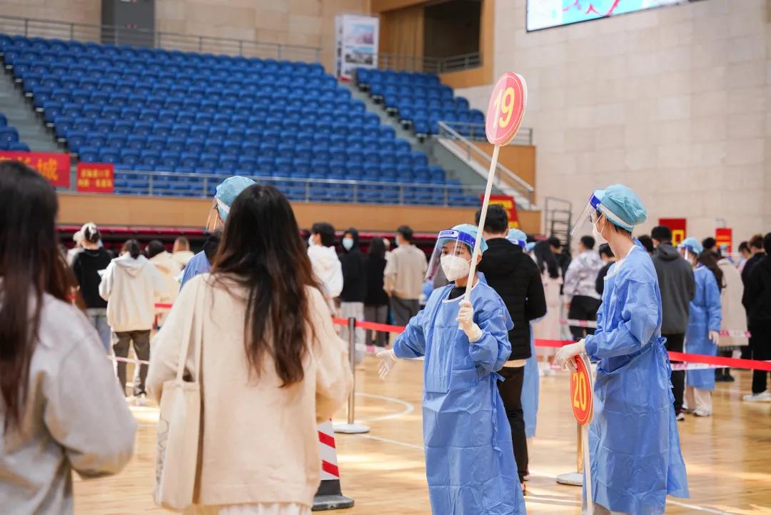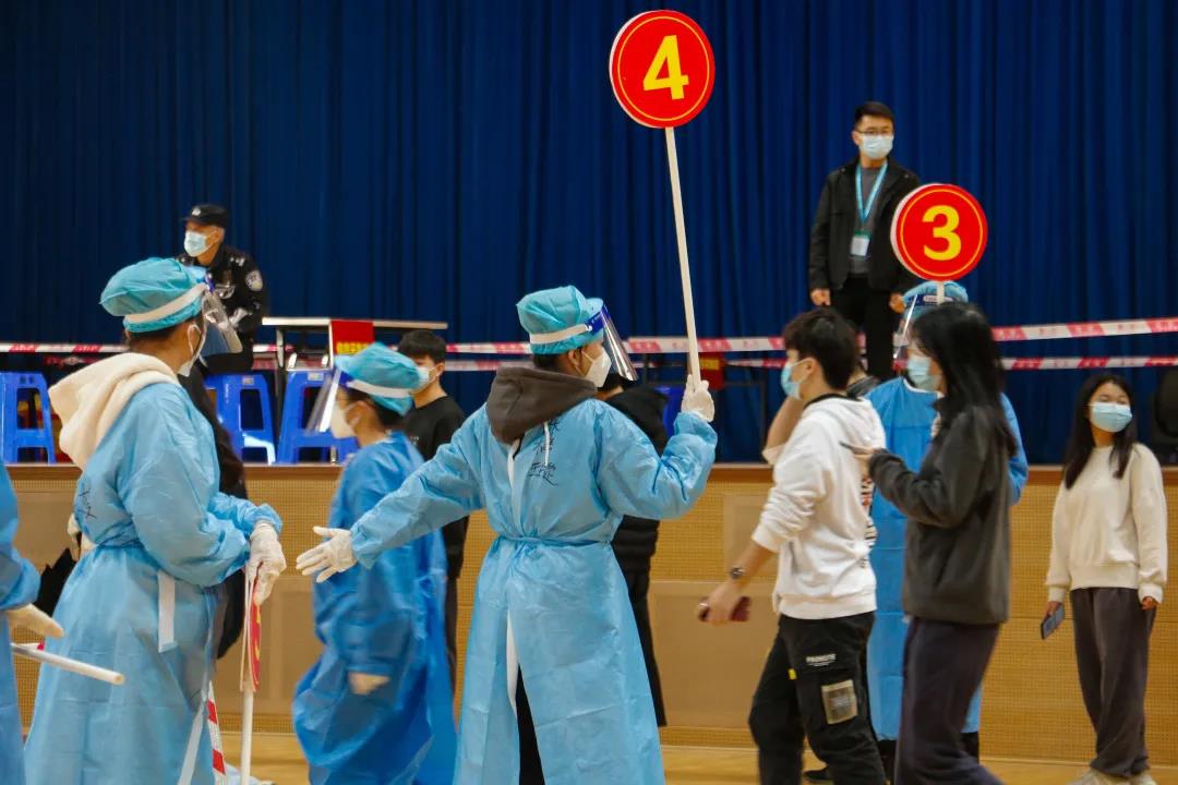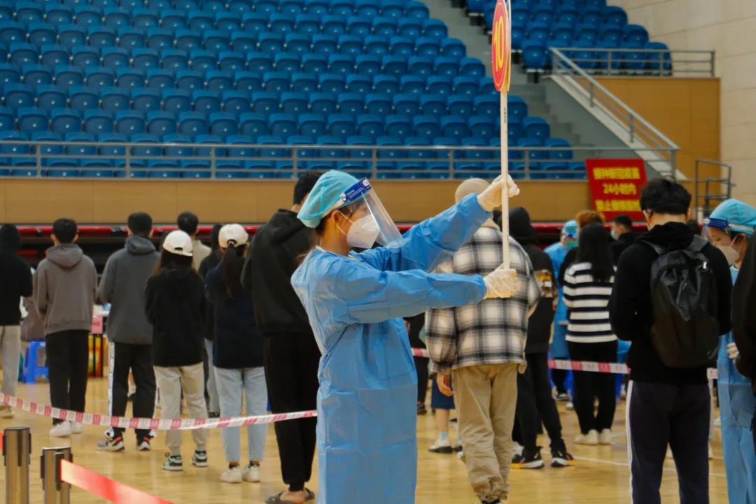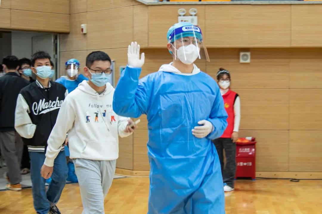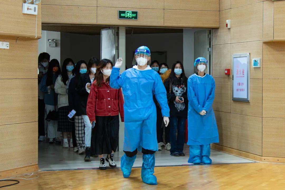 在核酸检测采样工作的现场,300余名身着蓝色防护服的志愿者引导师生分时段有序排队进入检测采样场地,为核酸检测工作的顺利进行提供保障。