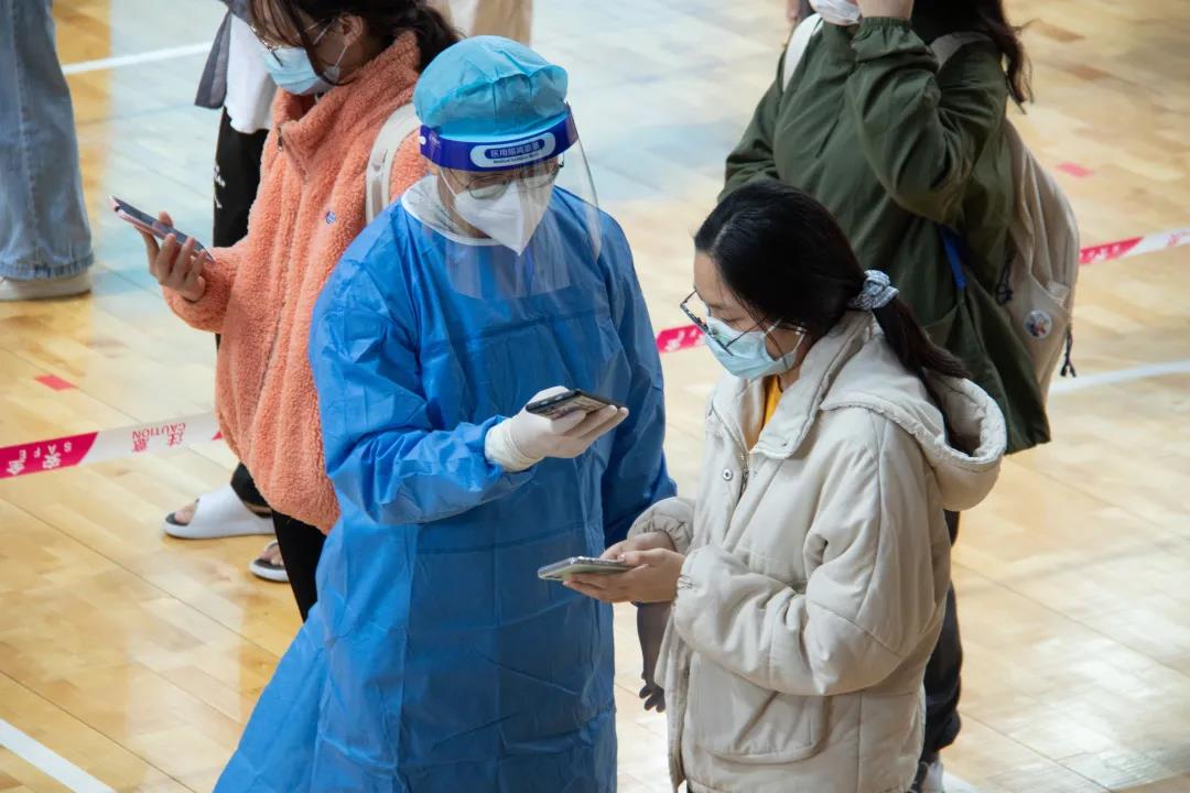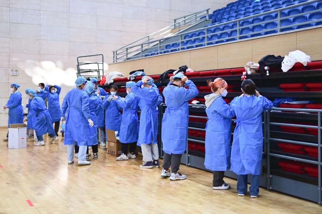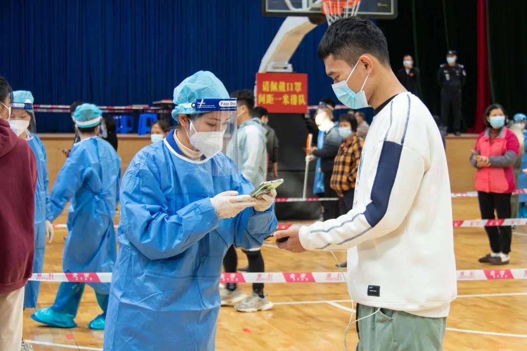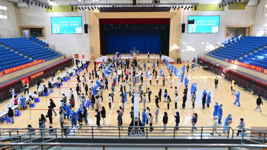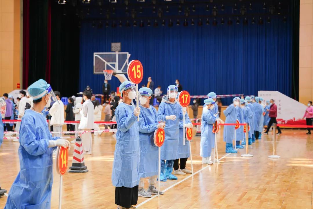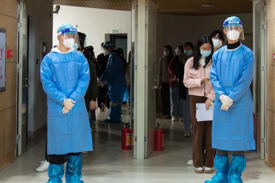 在核酸检测采样工作的现场,300余名身着蓝色防护服的志愿者引导师生分时段有序排队进入检测采样场地,为核酸检测工作的顺利进行提供保障。
