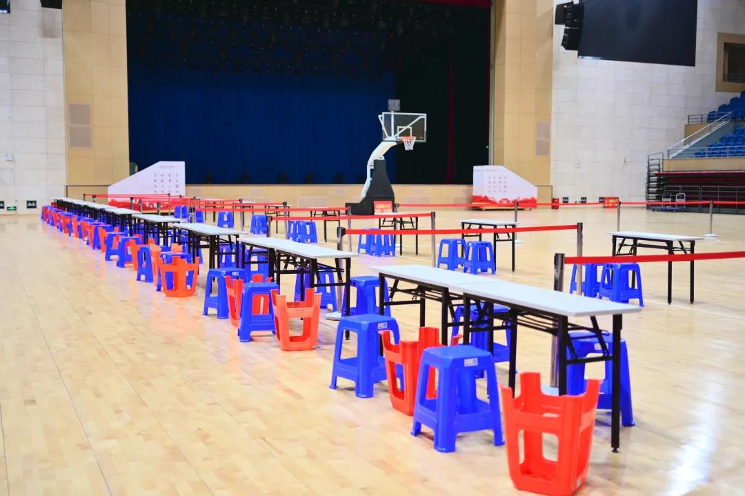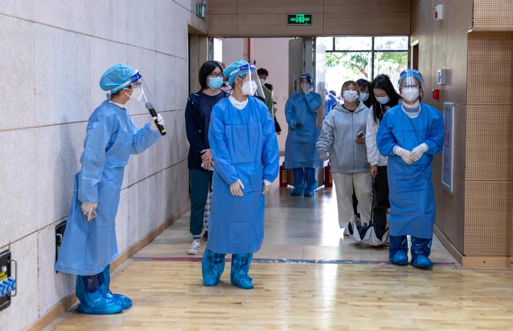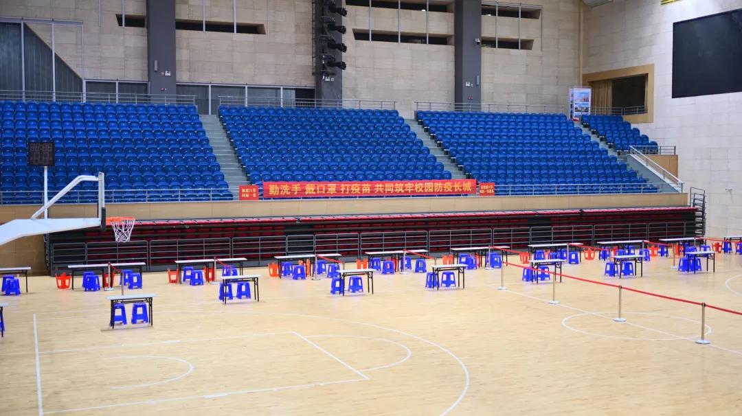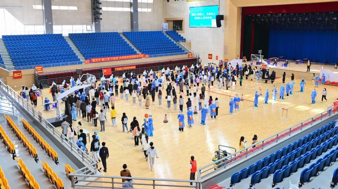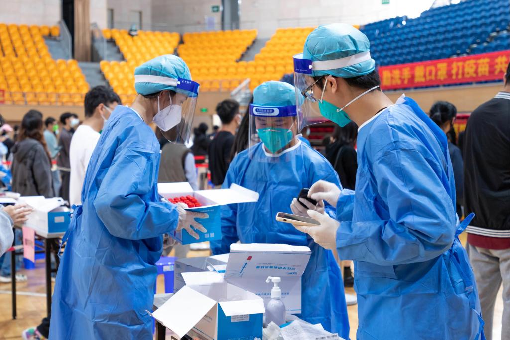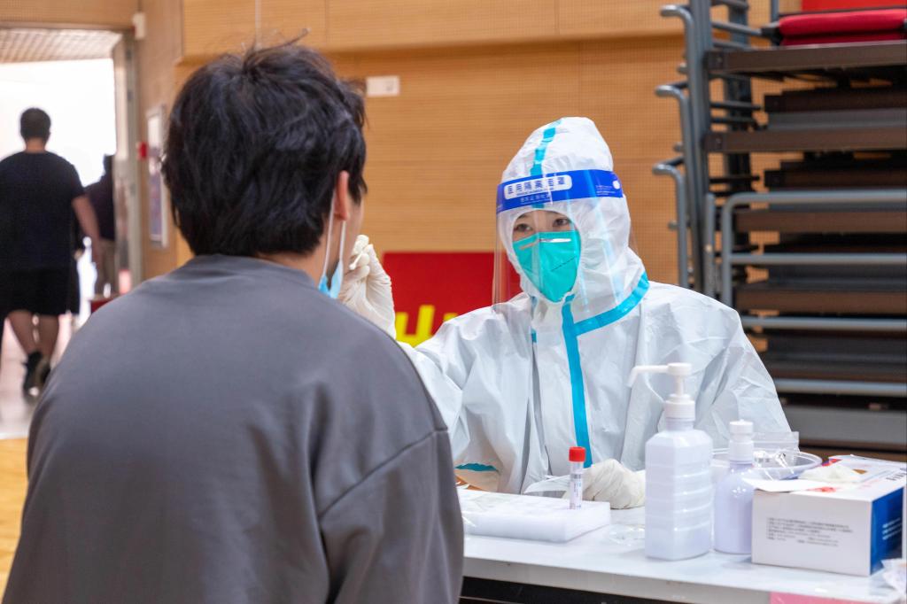 在核酸检测采样工作的现场,300余名身着蓝色防护服的志愿者引导师生分时段有序排队进入检测采样场地,为核酸检测工作的顺利进行提供保障。