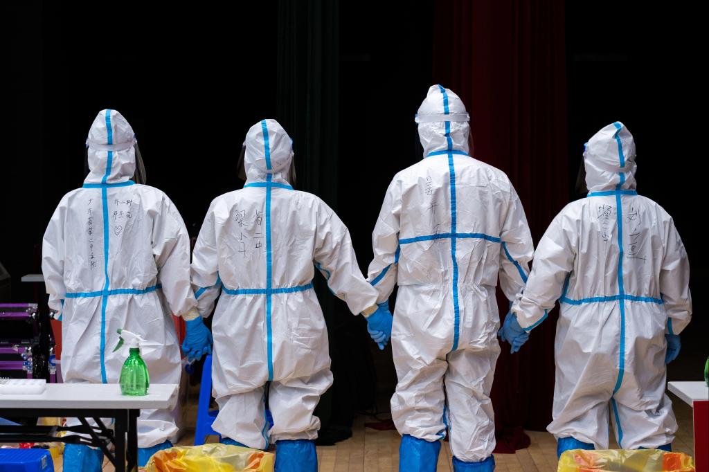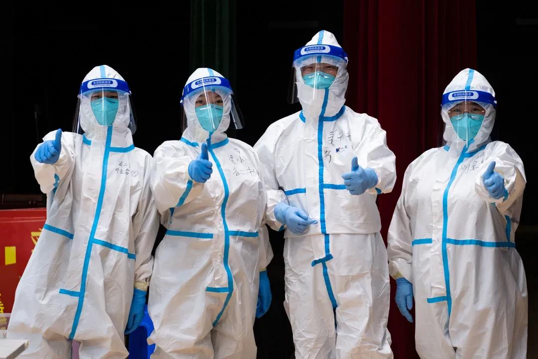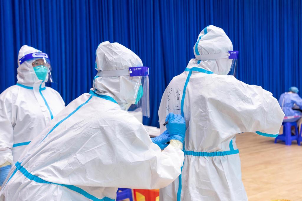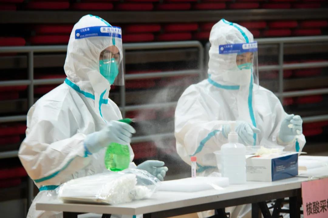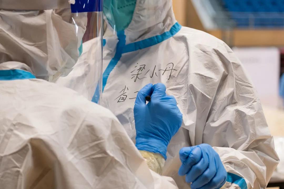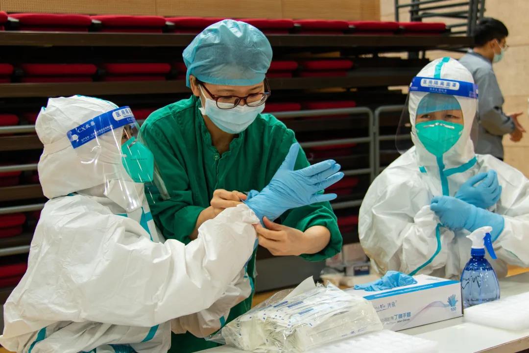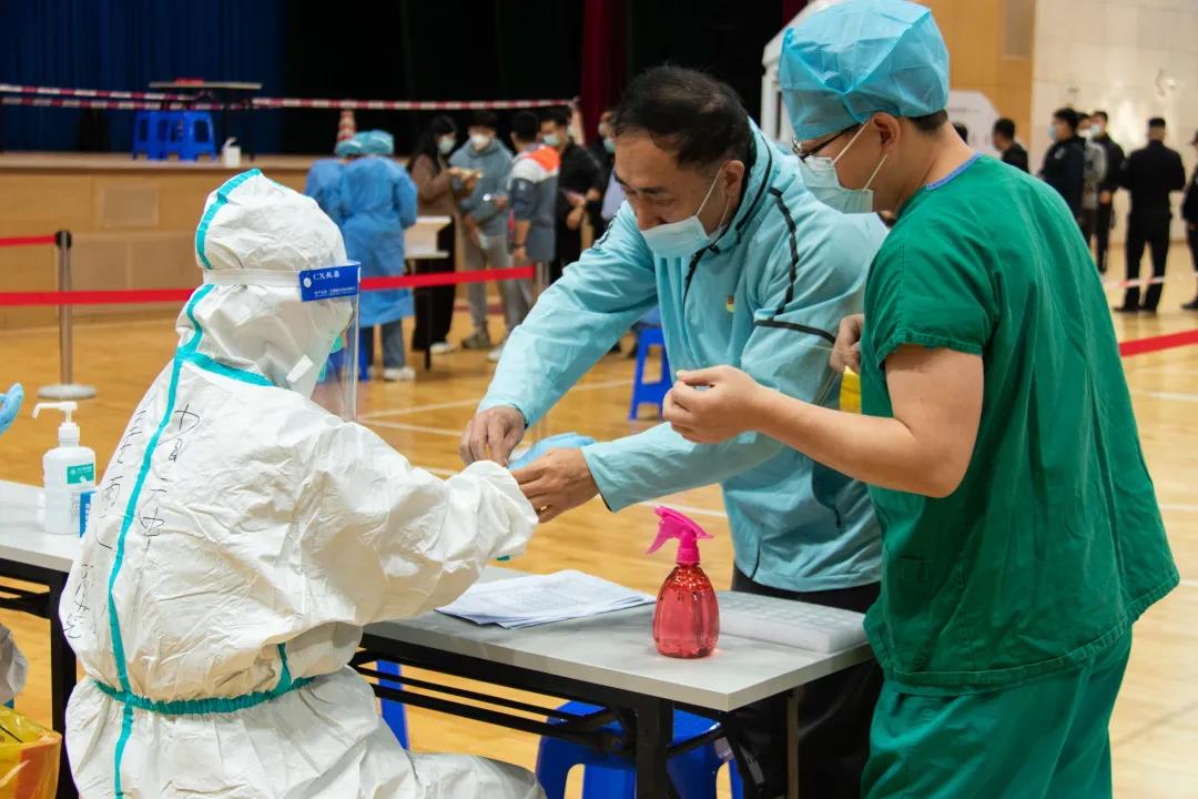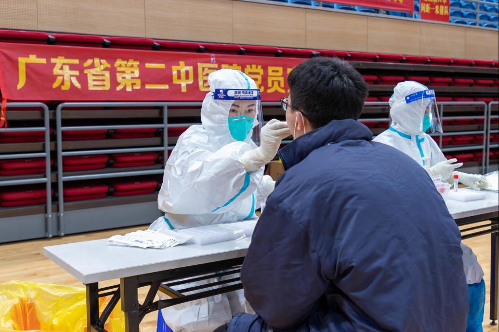 第二轮核酸检测采样工作中,广东省第二中医院派出党员医护人员组成党员突击队到场采集核酸检测样本。医护队员们穿着厚厚的防护服,娴熟地进行咽拭子标本采集,用一丝不苟的工作态度,认真负责地采集好每一个标本。