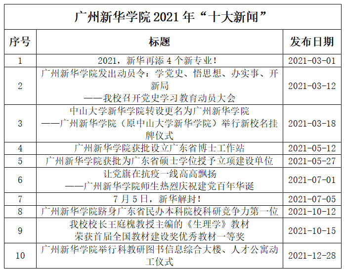 2021年是中国共产党成立100周年,也是广州新华学院完成转设的元年、学校“十四五”规划的开局之年。为深入学习贯彻习近平新时代中国特色社会主义思想,全面回顾学校2021年办学育人成就,进一步激励全校师生关心和支持学校教育事业发展,学校开展了2021年“十大新闻”评选活动。