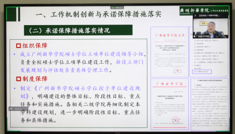 2月23日,广东省硕士学位立项建设单位2021年工作进展和建设成效汇报答辩会召开线上视频会议,本次会议共17所高校参会。广州新华学院(以下简称“我校”)校长王庭槐、副校长蔡照波、各硕士学位建设点负责人及相关职能部门负责人在广州校区参加会议。