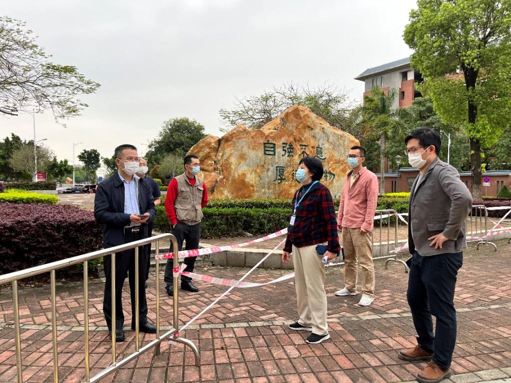 3月27日下午,东莞市教育局副局长邓柏松、四级调研员罗桂森、三级主任科员戚锐麟一行莅临我校东莞校区检查疫情防控工作。学校领导、疫情防控办以及各有关部门负责人一行陪同检查。我校党委书记周云同志汇报了我校东莞校区疫情防控情况,邓柏松副局长对我校防疫工作成效给予充分肯定,并对我校提出的相关问题给予悉心指导。