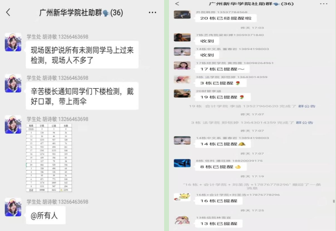 3月20日以来,为确保学校全员核酸检测工作快速有序进行,各楼长积极响应,及时将核酸检测指引发布到所负责的学生宿舍楼栋群中,并根据现场核酸检测推进情况不间断做好学生提醒工作,充分展现出队伍履职尽责、主动作为的风貌。此外,各学生宿舍楼长也通过“主动上门”“定期走访”等方式在宿舍区与宿管阿姨、同学们进行“零距离”“面对面”沟通交流,实时了解同学们所思所想所需,并及时上报相关部门,共同解决困难诉求,作好回访服务工作,协同打通学生社区教育管理服务“最后一公里”。