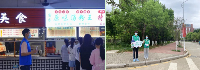 师生志愿者在各区域巡查,并为同学们提供口罩