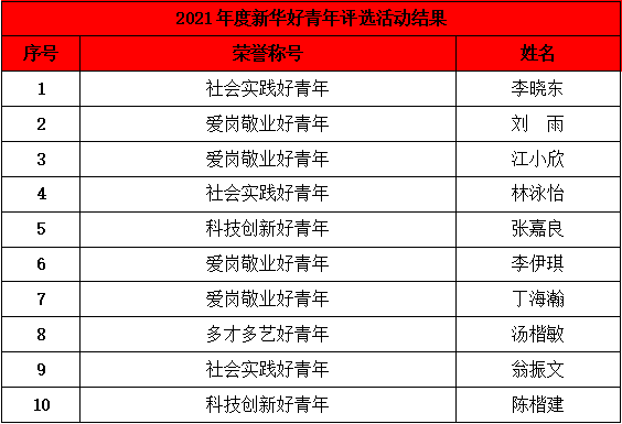 经过对线上投票结果与现场评委老师们的评分结果进行综合统计,2021年度新华好青年评选活动结果出炉。