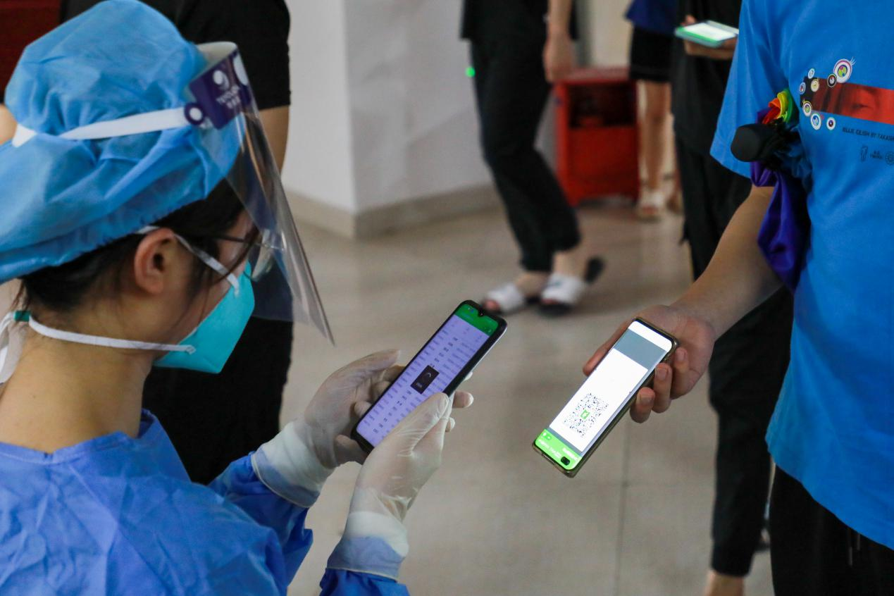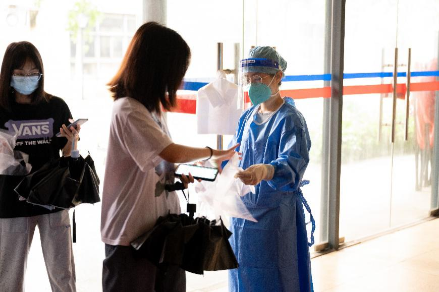 出口处,师生扫描iXH健康码有序离场,确保采样工作不漏一人