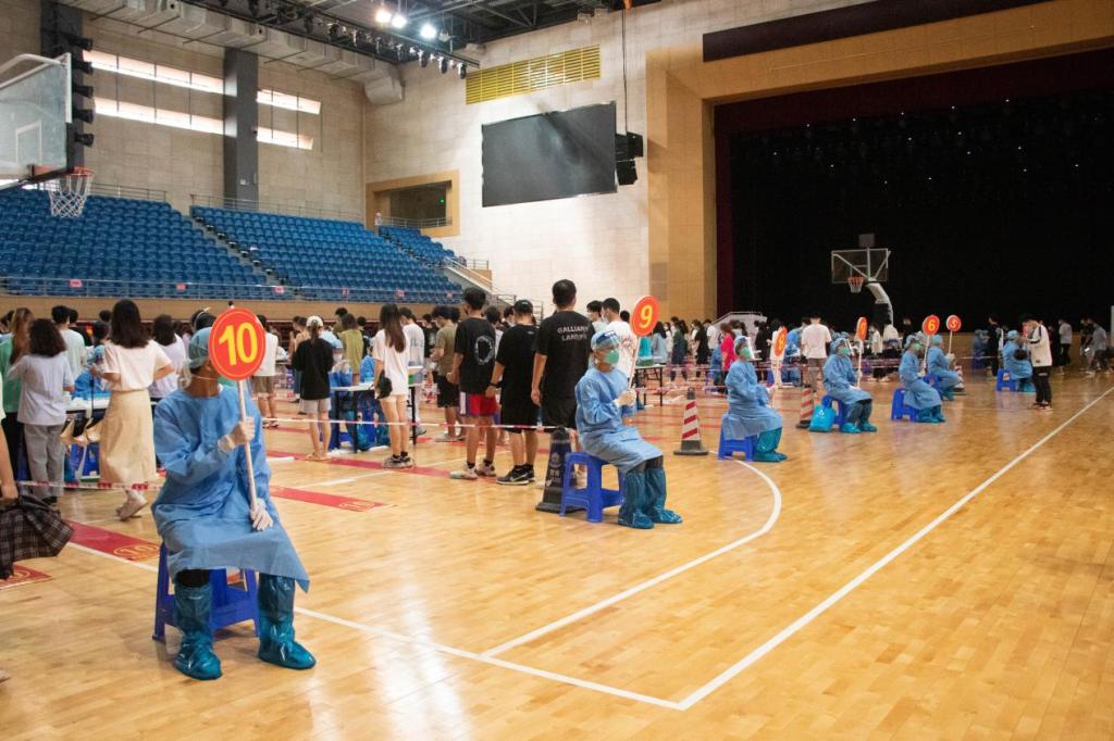 学校总务处、校团委等各职能部门统筹组织工作人员及志愿者推进管理协调、各功能区对接、出入口指引等工作。工作人员明确责任分工,分批次指引进入馆内。受检师生员工提前准备好葵花码,佩戴口罩并保持队列间距,依序进行核酸采样,完成核酸检测后登记iXH健康码迅速离场,现场秩序井然。