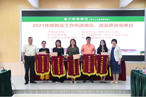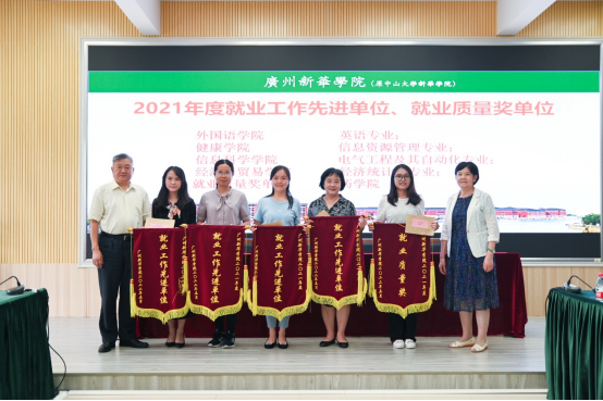 蓝永金宣读了《我校关于表彰2021年度就业工作先进单位的决定》。决定授予外国语学院商务英语专业、西班牙语专业、英语专业,公共治理学院人力资源管理专业、公共关系学专业,艺术设计与传媒学院服装与服饰设计专业,健康学院信息资源管理专业,信息科学学院电气工程及其自动化专业,经济与贸易学院经济统计学专业共9个专业为“2021年度就业工作先进单位”;授予药学院“2021就业质量奖”,并对达到我校初次就业率平均线以上的22个专业给予通报表彰。王庭槐校长与周云书记为就业先进单位颁奖。