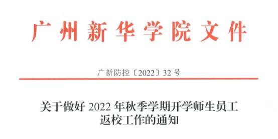 为贯彻落实国家、省、市和校区属地新冠肺炎疫情防控工作部署,全力维护师生员工身体健康和生命安全,根据广东省教育厅《关于做好2022年秋季学期开学疫情防控工作的通知》(粤教防组〔2022〕32号),按照上级主管部门及校区属地的疫情防控要求,结合我校工作实际,学校于8月份发布《关于做好2022年秋季学期开学师生员工返校工作的通知》(广新防控〔2022〕32号),全面部署我校2022年秋季学期开学返校相关工作。
