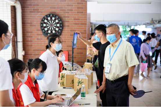 迎新现场,参与一线迎新工作的教职员工身着制服,展示出了广州新华“青椒”良好的精神风貌。
