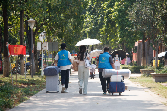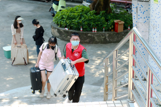 志愿者们耐心地为新生解答各种问题,不辞劳苦地一趟趟帮助新生搬运行李,细心叮嘱各项防疫政策,并一路将各位新生送至宿舍办理入住。热情周到的服务很快消除了新生们初来乍到的陌生感,感受到了广州新华大家庭的温暖。