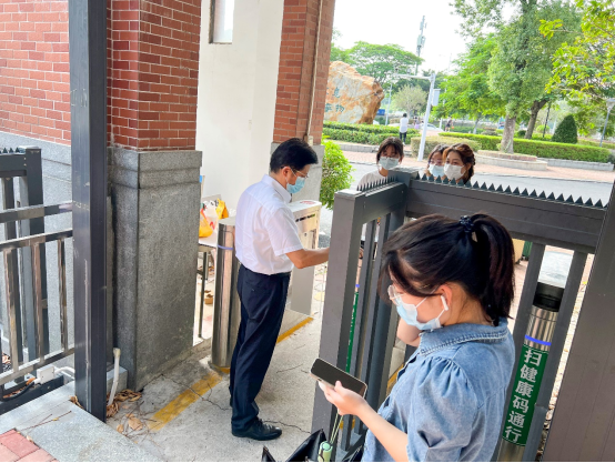 国庆假期,校长王庭槐(左三)和总务处处长、东莞校区防控办执行主任谢凯忠(右一)在快递点进行疫情防控专项检查
