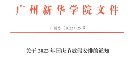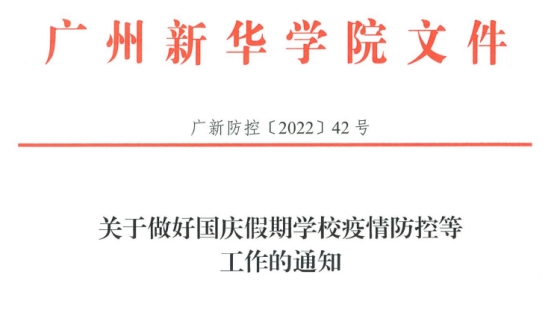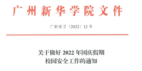 我校于国庆假期前夕发布《关于2022年国庆放假安排的通知》(广新办〔2022〕25号)、《关于做好国庆假期学校疫情防控等工作的通知》(广新防控〔2022〕42号)、《关于做好2022年国庆假期校园安全的通知》(广新保卫〔2022〕12号)等通知文件,统筹校内各单位从严、从紧、从细做好各项工作,确保师生度过一个安全健康、平稳有序、丰富多彩的国庆假期。