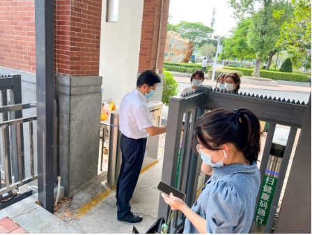 我校校长王庭槐(左三)和总务处处长、东莞校区防控办执行主任谢凯忠(右一)在快递点进行疫情防控专项检查