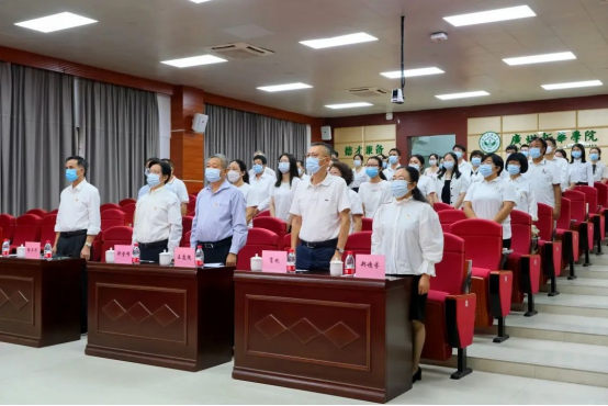 广州新华学院参加线下集中观看的党政领导干部、师生党员代表齐唱国歌