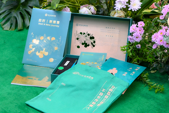 精致的签字笔与笔记本,供学子一笔一划写下似锦前程;刻有“广州新华学院”字样的金属胸针与印有学校校徽的火漆印章,镌刻着学子们过去的每一份努力,也将成为学子们迈入大学后的第一枚“勋章”。实用百搭的定制帆布包,伴学子们开启崭新的求学之旅;在定制牛皮纸信封中,写下“致毕业后的自己”的一封信,于学有所成时亲启。