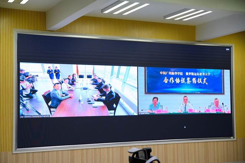 9月13日,在第八届东方经济论坛举行之际,广州新华学院(下文简称“我校”)与俄罗斯远东联邦大学签署合作协议。远东联邦大学校长鲍里斯·尼古拉耶维奇·科罗贝茨、外事副校长叶甫根尼·叶甫根尼耶维奇·弗拉索夫,我校副校长马龙海,董事会秘书刘东瑶,外事处中俄教育合作项目主任王骏涛出席在符拉迪沃斯托克(海参崴)签约现场,我校董事长刘荣海,校长王庭槐,党委书记郝登峰,副校长李中生、姚正安,董事会董事、学校副校长刘婉莉(霖霖),经济与贸易学院院长袁持平,外事处处长康星华出席在我校东莞校区现场。