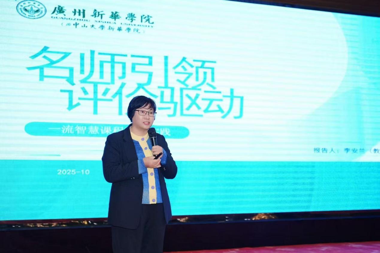 在下午的会议议程中,李安兰进行了题为《名师引领,评价驱动:广州新华一流智慧课程建设实践》的专题报告。报告中,李安兰详细介绍了学校会计学院在智慧课程建设方面的探索历程、创新理念与实践模式。她强调,通过名师团队的引领示范作用以及科学有效的教学评价体系驱动,学院系统性地推进了智慧课程的顶层设计、资源建设、教学模式改革与持续改进机制,最终形成了具有“新华”特色的一流智慧课程建设路径与显著成果。